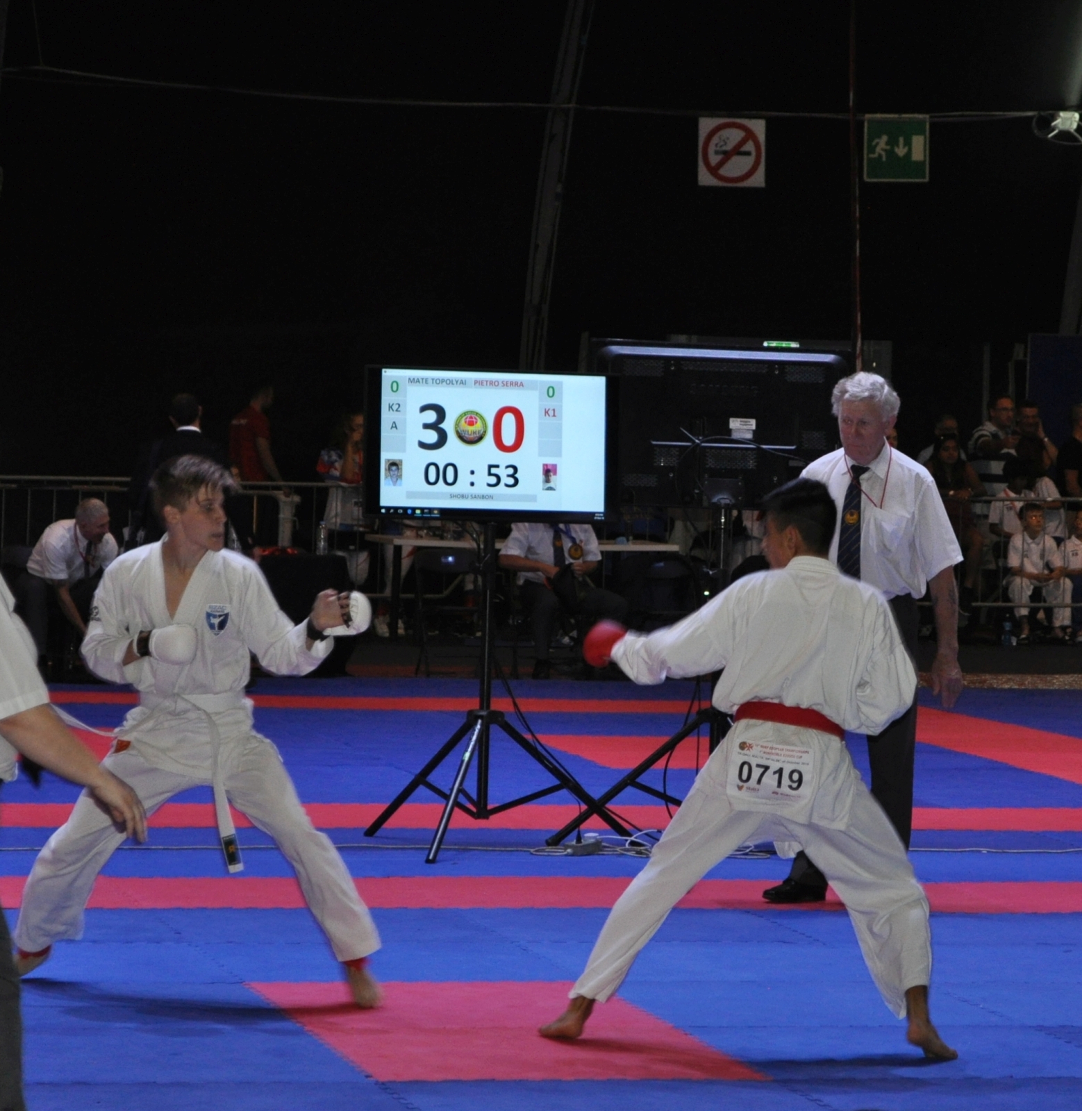 Topolyai Máté kadet korosztály (15-17 éves) -55 kg-os kumite kategóriájában ezúttal is nagyon jó formában versenyzett, az érmet jelentő négyközé jutásnál is 5-0 arányban vezetett néhány másodperccel a mérkőzés vége előtt, amikor is többször is vitatható döntéssel leléptették, így Máté 5. helyen végzett.